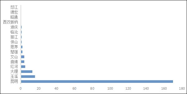 云南省下轄8個(gè)地級市、8個(gè)自治州,合計(jì)16個(gè)地級行政區(qū)劃單元,省會昆明市。本次調(diào)查的云南省環(huán)保企業(yè)數(shù)量的地區(qū)分布如圖6。