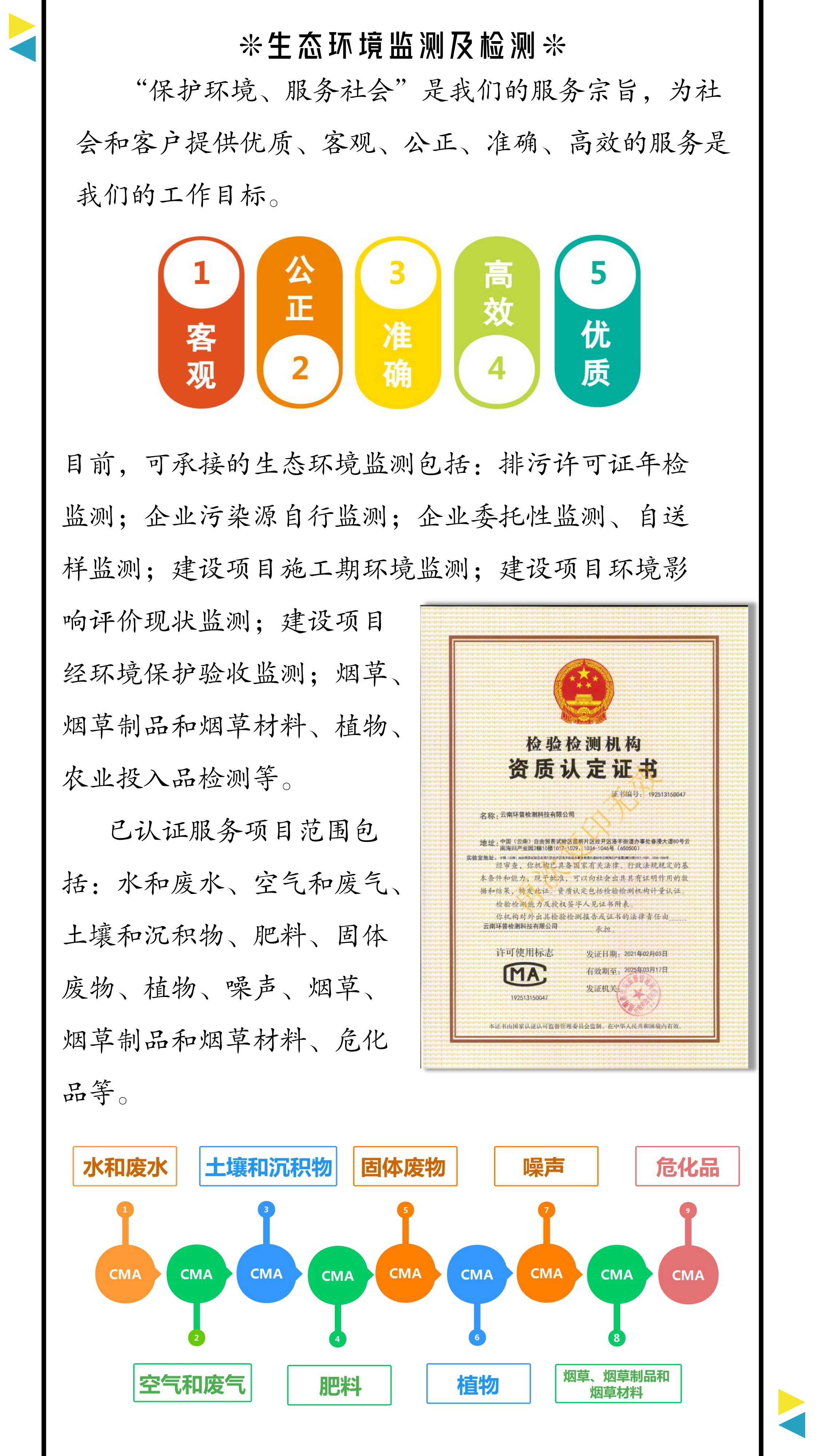 檢測范圍包括:排污許可證年檢監(jiān)測;企業(yè)污染源自行監(jiān)測;企業(yè)委托性監(jiān)測、自送樣監(jiān)測;建設(shè)項目施工期環(huán)境監(jiān)測;建設(shè)項目環(huán)境影響評價現(xiàn)狀監(jiān)測;建設(shè)項目經(jīng)環(huán)境保護驗收監(jiān)測;煙草、煙草制品和煙草材料、植物、農(nóng)業(yè)投入品檢測等