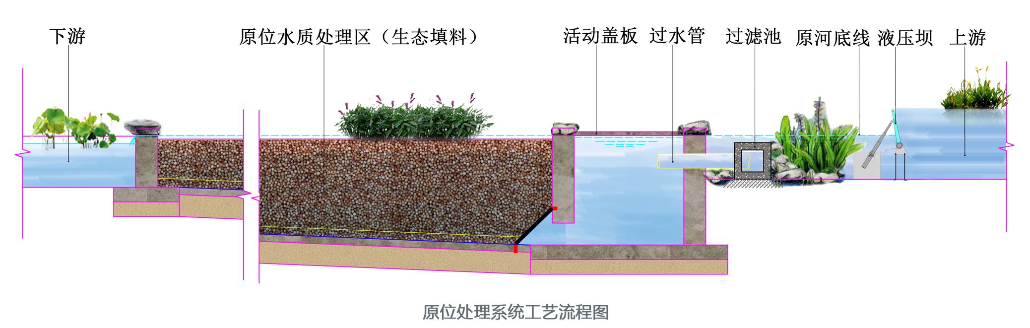 主要利用河道的河床,在河床下建設(shè)處理單元。在不降低行洪標(biāo)準(zhǔn)的前提下,通過自動控制的壩體調(diào)整河道水位高差,將污染水引入水下處理單元,采用具有針對性的脫氮除磷強(qiáng)化填料做基質(zhì),對水質(zhì)進(jìn)行凈化。用于周邊土地資源緊張的城市河道治理。