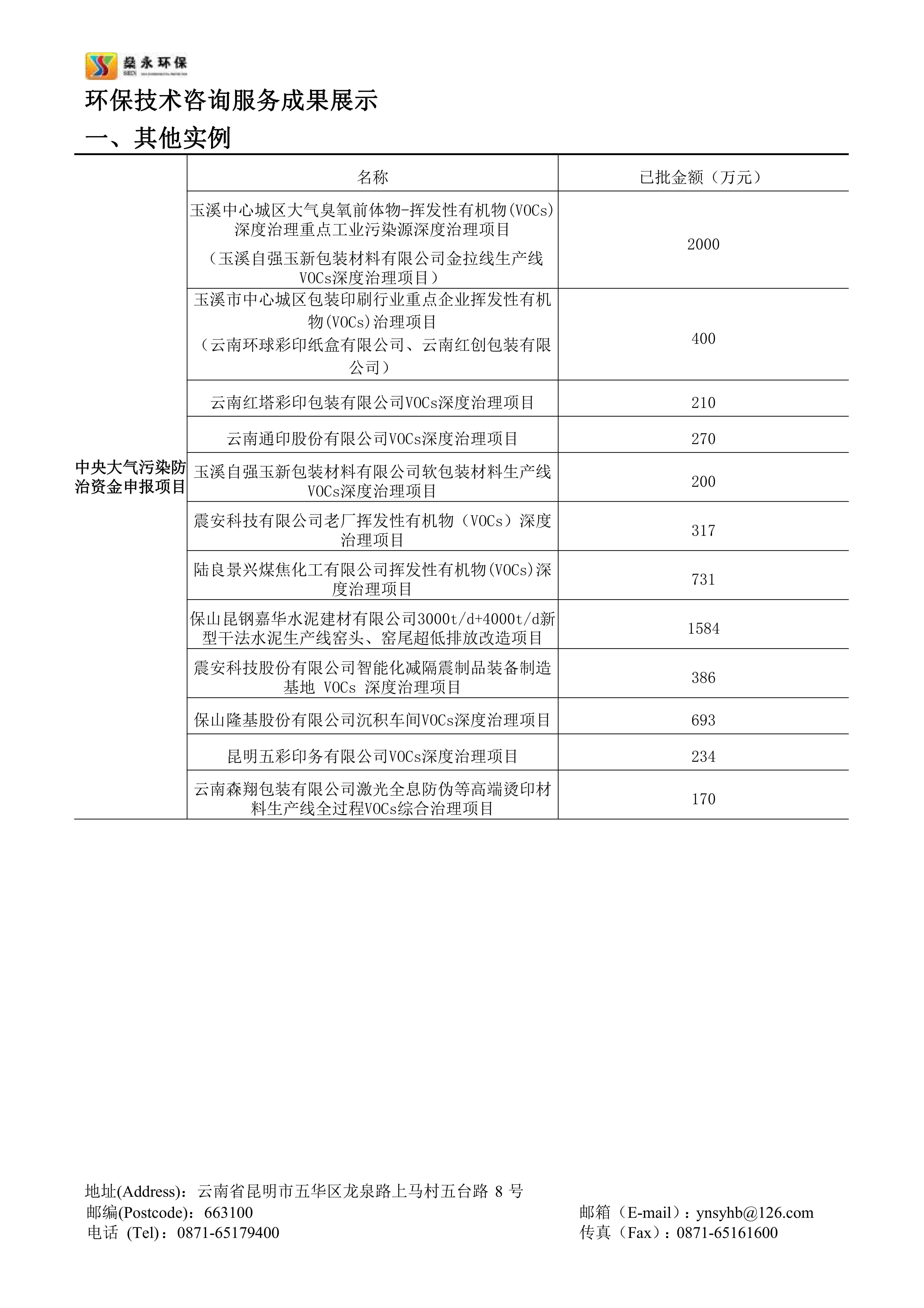 截止2023年10月,公司幫助云南省多個(gè)行業(yè)企業(yè)成功申報(bào)的中央大氣污染防治資金已入庫項(xiàng)目共計(jì)20余個(gè),申報(bào)項(xiàng)目已獲批總資金近一億余元。公司承接的云南省內(nèi)中央大氣污染防治資金申報(bào)項(xiàng)目申報(bào)成功率高,成效顯著,服務(wù)細(xì)致高效,在云南省中央大氣污染防治資金申報(bào)領(lǐng)域具有豐富的經(jīng)驗(yàn)。